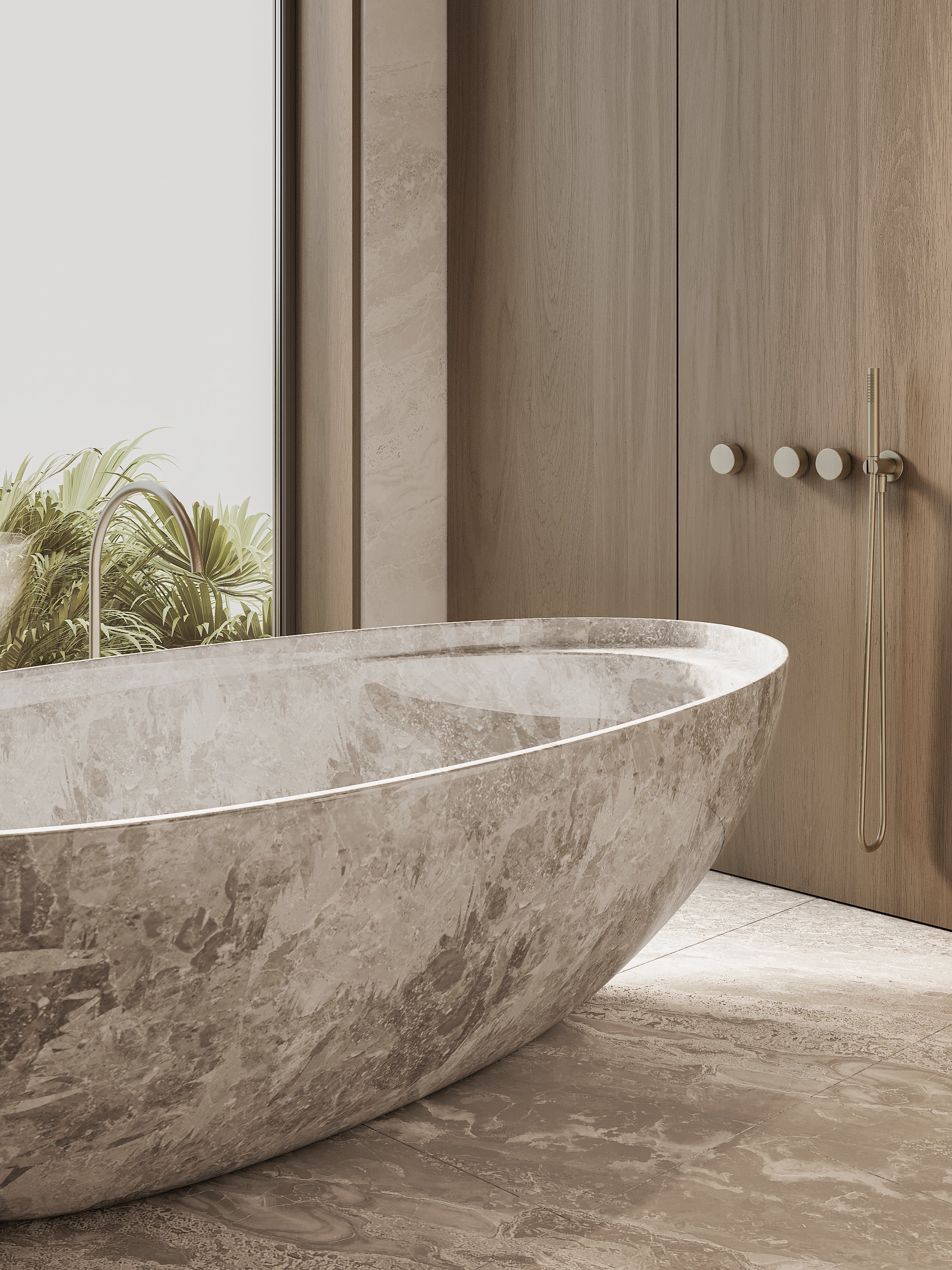 76" x 39" Handcrafted Oval Stone Bathtub with Shelf - CLOUD GRAY